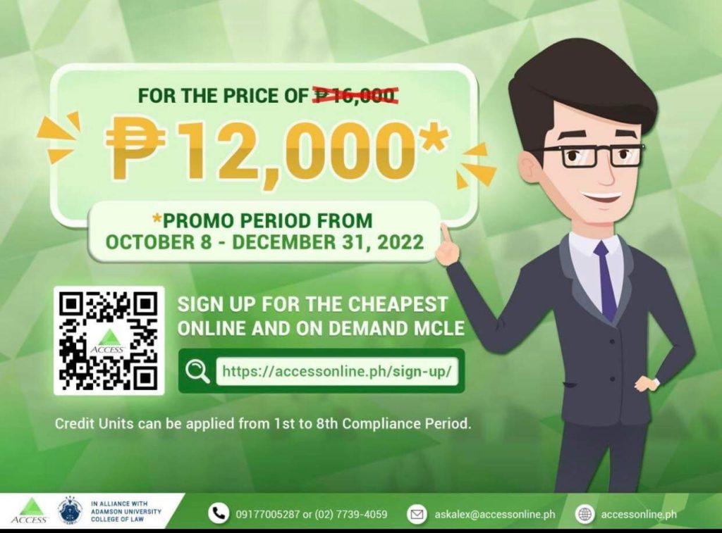 ACCESS MCLE is currently offering its premium online and on-demand MCLE courses at the price of P12,000 for a limited time. New online classes have recently been added, covering a carefully curated selection of topics.