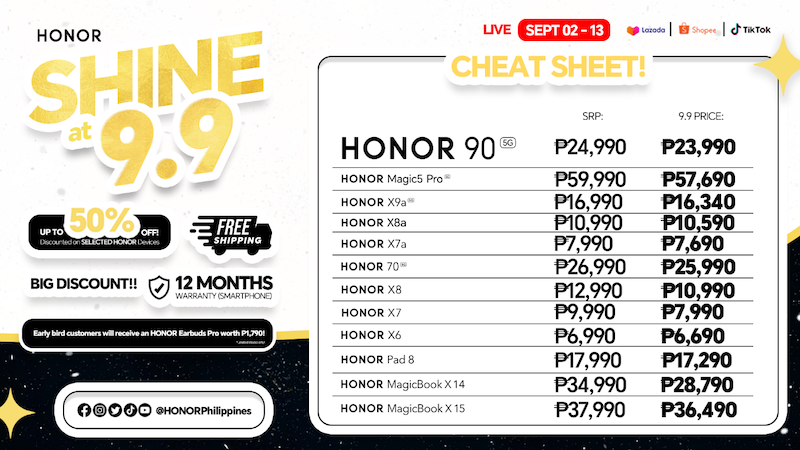 This 9.9 Sale is the perfect time to spoil yourself with some of your favorite HONOR Gadgets. You can save up to Php 2,300 and get a FREE HONOR Band 6 worth Php 1,790 when you shop on Shopee (bit.ly/HONORShopeeShine99), Lazada (bit.ly/HONORLazadaShine99), and TikTok (bit.ly/HONORTikTokShine99) from September 9 to September 13, 2023!
