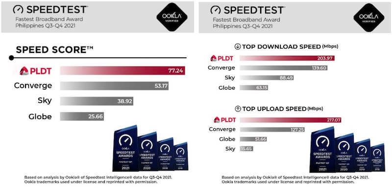 With a Speed Score of 77.24 at the Ookla Speedtest Awards for Q3-Q4 2021, PLDT Home continues to be the Philippines’ fastest broadband network, outperforming telecom competitors.